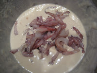 Mens dejen hviler, ordnes blæksprutterne. Træk ben og krop fra hinanden, fjern stiveren i kroppen og skyl grundigt mens den slimede hinde gnubbes af. Skær kroppen i ringe af knap 1 centimeters bredde. Skær benene fra øjne osv (det der snaskede i midten…) og del dem i 2 og 2 – de smager også skønt. Læg alle delene til tørre på et par stykker køkkenrulle.