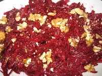 Rødbedesalaten laves ved at at skrælle og rive rødbederne på den grove side af rivejernet. Rør dressingen sammen og vend rødbederne i – drys med knust valnød!