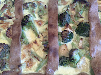 Når tærtebunden er forbagt, fordeles broccolien heri. Derefter kommes osten over og æggeblandingen hældes på. Hvis du har lidt ekstra dej, kan et par strimler lægges “dekorativt”