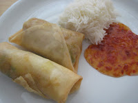 Engang for mange år siden prøvede jeg at lave forårsruller selv, og der var det noget med pandekager bagt på den ene side, den ubagte side udad og så dybstege med fyld. Det var SÅ svært at lave og blev ikke videre vellykket, og så er det aldrig rigtig blevet til mere. Jeg har set en del opskrifter på forårsruller hvor det så noget nemmere ud, og med den købte forårsrulledej var det måske ikke nem mad, men tilgængelig, og yderst vellykket. Vi serverede dem bare med lidt kogt ris, chilisauce og soya, og det blev altså lidt for fedt. Næste gang må der grøntsager til og måske noget karrysauce til risene. Og så vil jeg prøve bare at pensle dem med olie og bage dem i ovnen, sådan som Hanne beskriver.