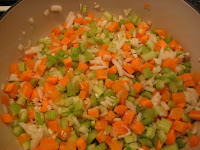 Hak grøntsagerne i små tern, og svits dem i lidt olie. Når de er faldet sammen tilsættes resten af ingredienserne, og sovsen koges uden låg i ca. 30 minutter. Blend sovsen med en stavblender om smag den til med salt og peber.