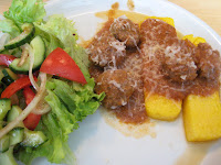 Jeg startede i fredags med en gang falafel (et sikkert hit), og i dag stod den så på polenta med kødboller. Jeg har et ret begrænset budget og polenta er altså god og billig mad. Jeg har lavet det en del gange før, men af uvisse årsager er det sådan noget jeg laver nogle gange, alle kan lide det – og så går der bare år før jeg laver det igen.