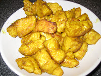 Skær 3-4 kyllingebryster i store tern, vend dem i hvedemel (ca. 1 dl)blandet med karry(2 spsk), salt og peber – jeg plejer at komme det hele i en frysepose, og få en af ungerne til at ryste den. Rist kyllingen af i en stor gryde – gerne af et par omgange, tag det op og stil det til side.