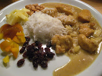Servér med velkogte basmatiris, peanuts, rosiner, kokosmel, ananasstykker, mangochutney og hvad du ellers har – Velbekomme.