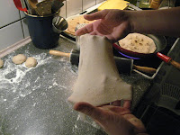 Opløs gæren i vand, tilsæt salt samt mel lidt af gangen og ælt til du har en smidig dej. Lad den hæve en times tid, og del til ca. 12 små boller. De rulles meget fladt ud – det kræver en del mel, men dejen er også god at trække i, så man kan hive lidt i den til den er flad nok. Kom en af gangen på en varm, tør pande og bag ca 1 minut på hver side. Med mindre du har en gigantisk pande, bliver fladbrødene noget mindre end de købte – det betyder dog bare at du kan spise nogle flere.