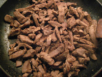Skær kødet i strimler (mine var lidt for store, de skal nok ikke være mere end 1×2 cm) – skær alt synligt fedt og evt. sener fra. Knus krydderierne, bland med eddike og hvidløg og hæld det over kødet. Lad det trække et par timer på køl – vend posen/bøtten et par gange. Varm en stor pande op, hæld kødet på (med marinade, uden olie), lad det væden koge ind og svits til kødet får stegeskorpe, det tog ca. 20 minutter herhjemme.